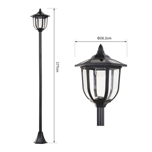Traditional style outdoor lamp for a beautiful addition to your garden or house front Six inner LED lights powered by top solar panels which provide up to eight hours of light when fully charged Thick and rigid plastic pole with a ground stake included to keep it secure to ground With a safe-to-use outdoors IP44 rating Intelligently switches on and off when not needed, with a switch for manual operation Easy to assemble simply fit the parts together.