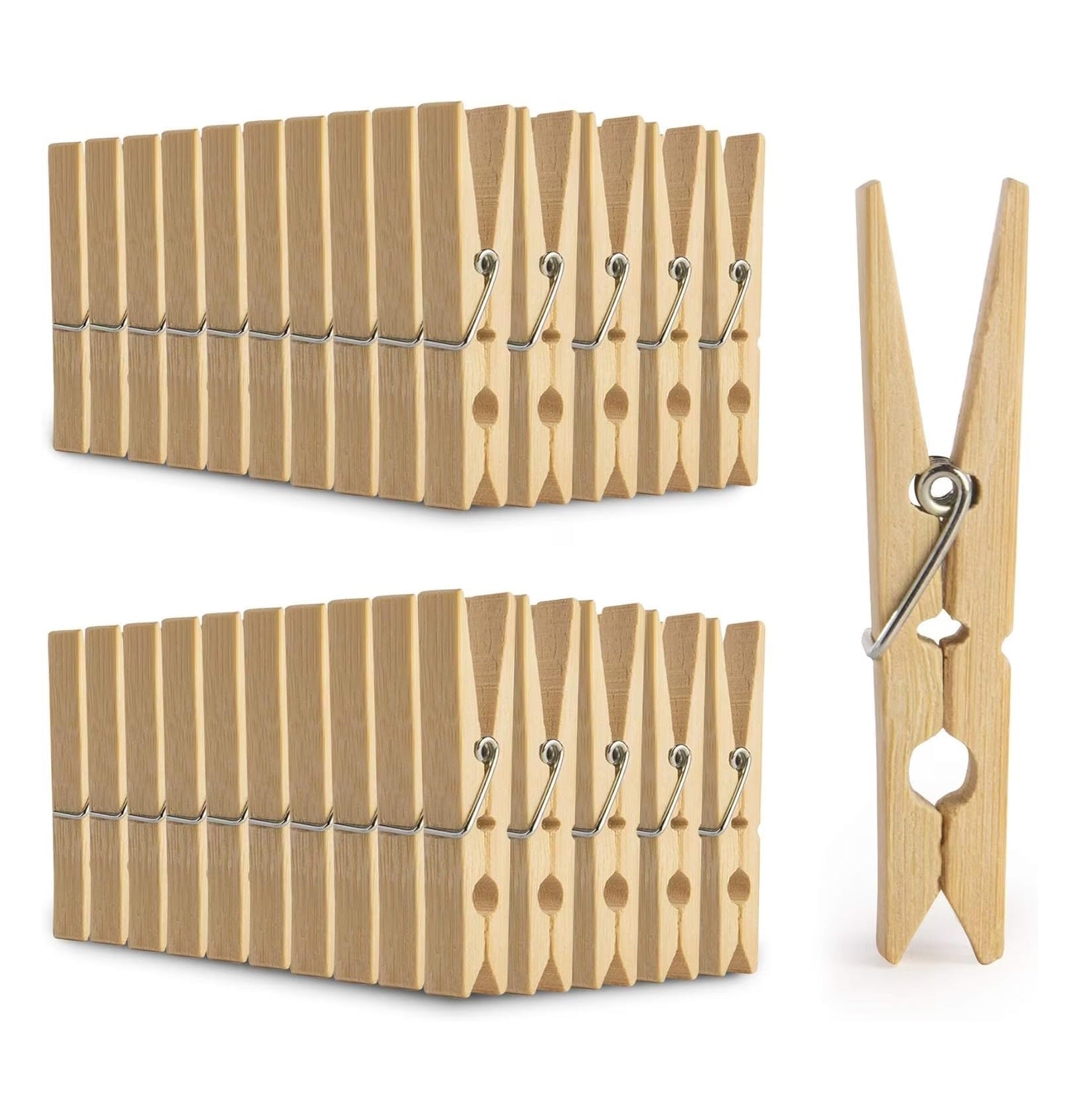 Set of 100 bamboo pegs, with an ample 7.2cm in size, designed to make hanging clothes, crafts, photos, and more a breeze. Crafted from sustainable bamboo, these pegs offer durability, reliability, and a touch of eco-friendliness to your daily chores. Say goodbye to flimsy pegs that break easily and hello to sturdy, long-lasting solutions. Whether you're drying clothes on the washing line or getting creative with crafts, our bamboo pegs are up to the task.