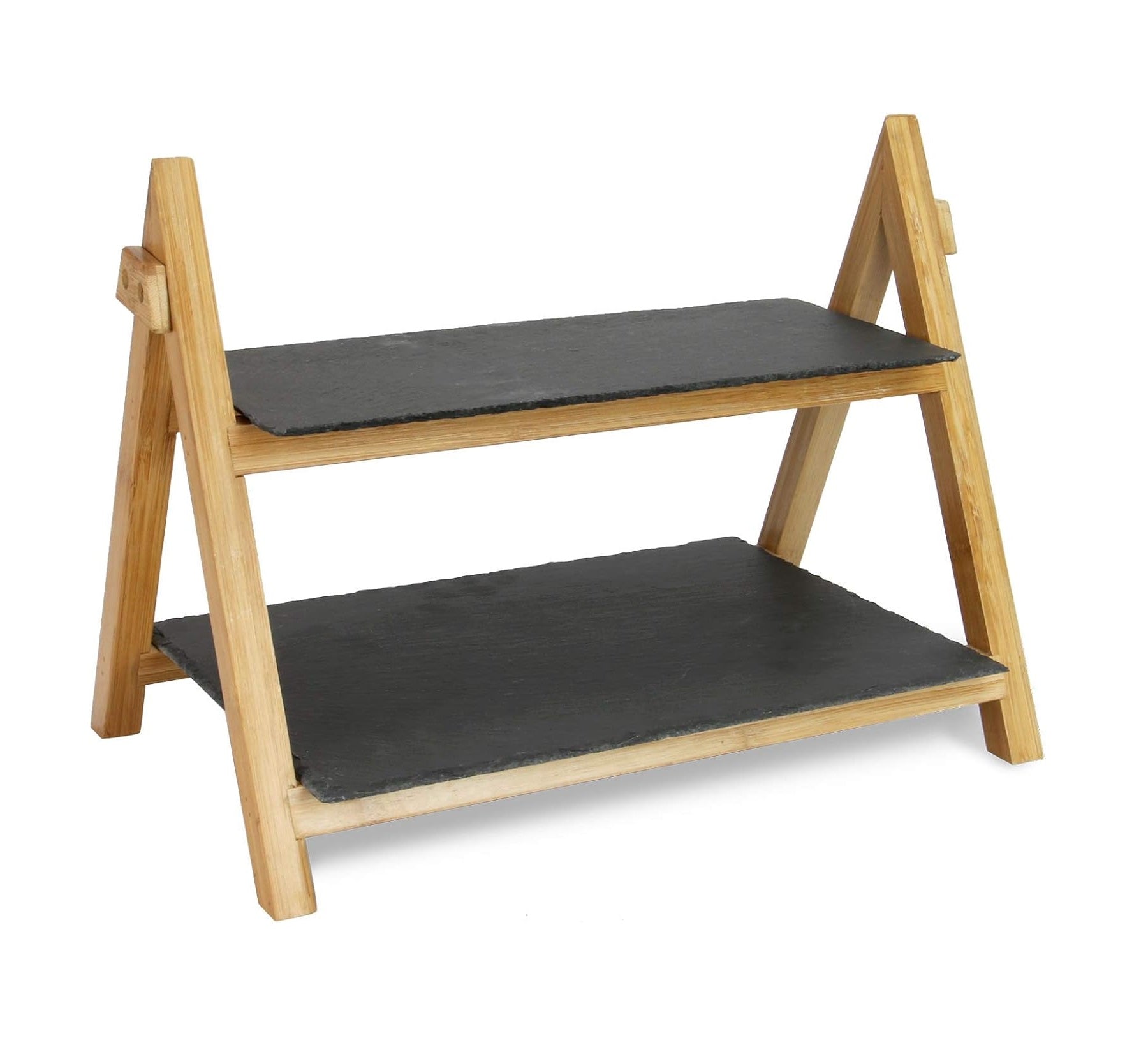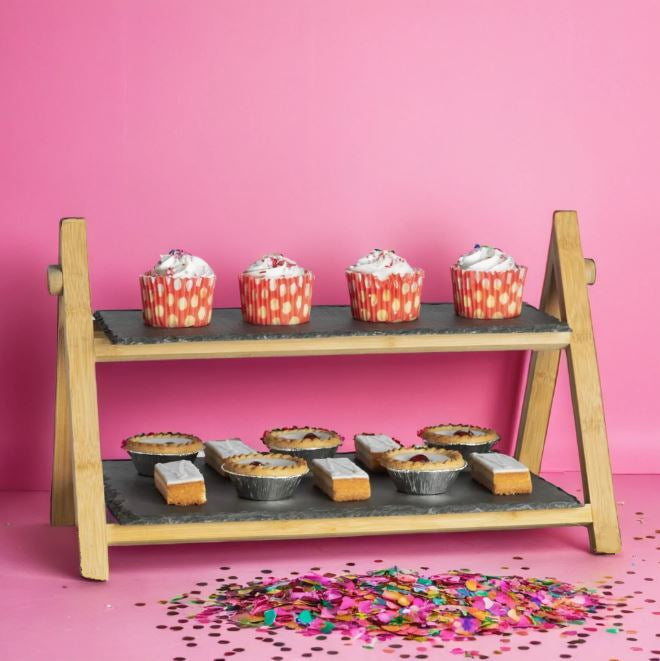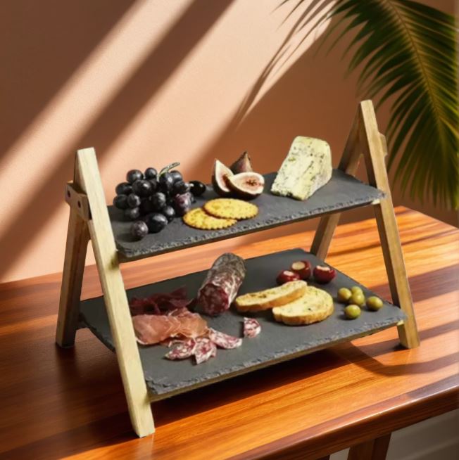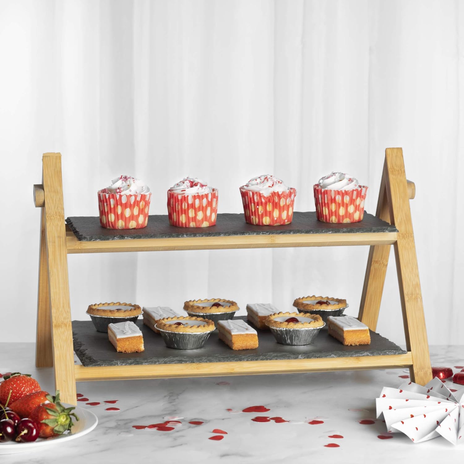 Crafted from high-quality slate, this cake stand not only offers a sturdy and durable platform for your culinary creations but also adds a touch of natural beauty to your table setting. Its unique texture and colour make it an ideal choice for those seeking a rustic yet refined aesthetic. This afternoon tea stand is more than just a cake stand; its a multifunctional masterpiece. Use it as a cupcake stand to showcase your beautifully decorated cupcakes, or as a charcuterie board to present an assortment of cheeses, meats, and antipasti. The two-tier design provides ample space for a variety of tapas dishes, making it perfect for serving platters at parties. Its foldable feature ensures easy storage and portability, allowing you to effortlessly transform any space into a stylish display area.