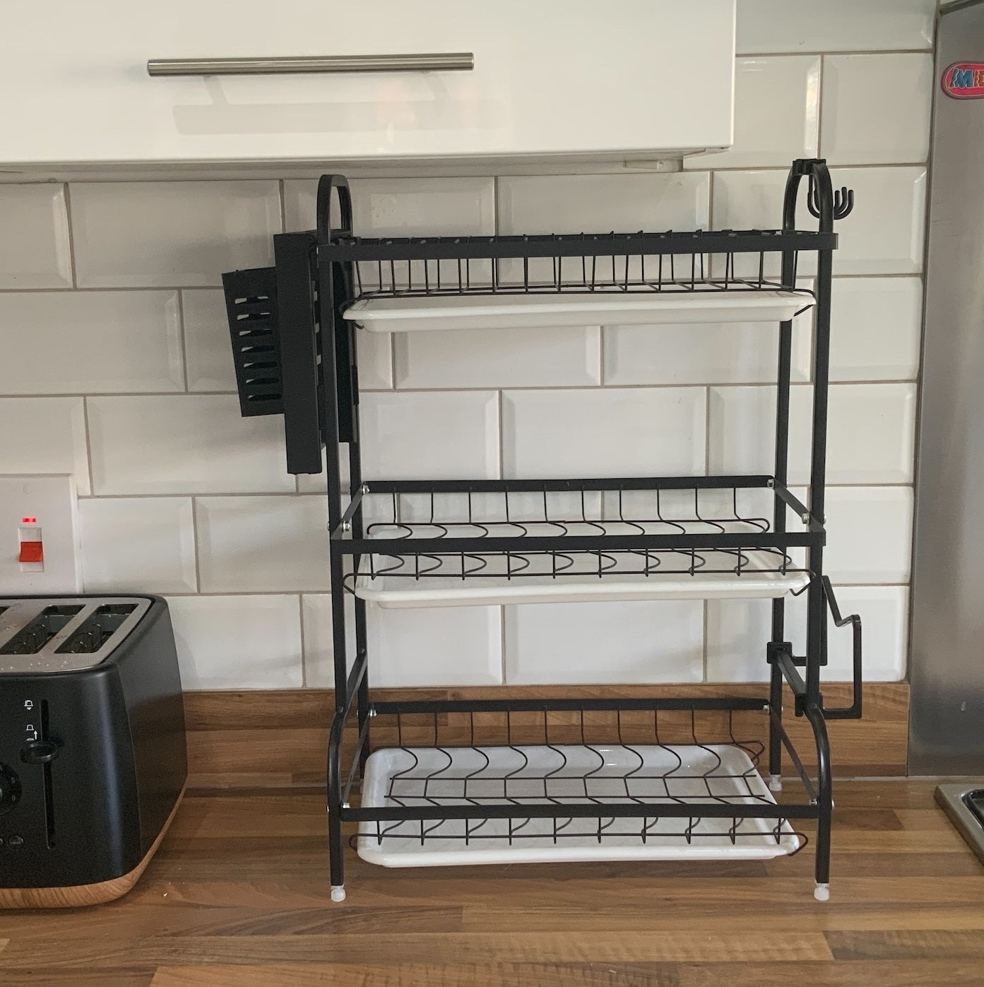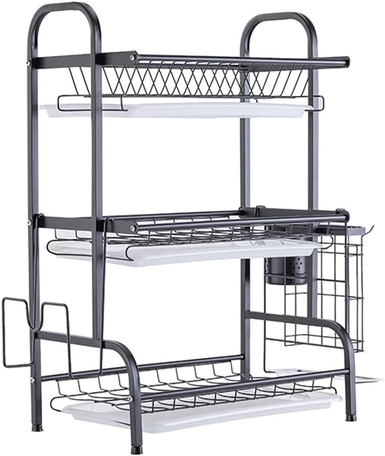 Two Tier Dish Drainer: Hold plates along with additional bowls and glasses. It also includes a removable utensil holder and upgraded knife drainer and chopping board rack. Also includes 3 hooks.