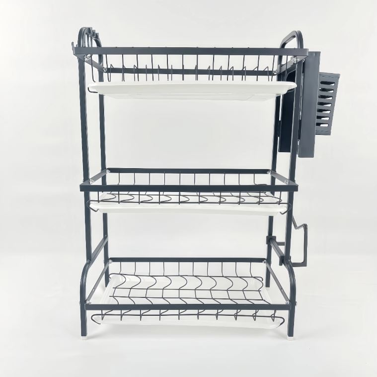 Designed with a practical 3-tier system, this rack offers ample space for drying plates, bowls, glasses, and utensils, helping you maximise your kitchen space while keeping everything neatly arranged. Each tier is equipped with a removable drain tray, allowing water to drain, so you never have to worry about water accumulating on your countertop. Additionally, the rack includes a versatile utensil holder that can be easily hung on either side of the rack, providing convenient storage for forks, spoons, knives, and other small kitchen items. This sleek and functional dish drying rack is perfect for keeping your kitchen tidy, making your dishwashing routine hassle-free and your space more organised.