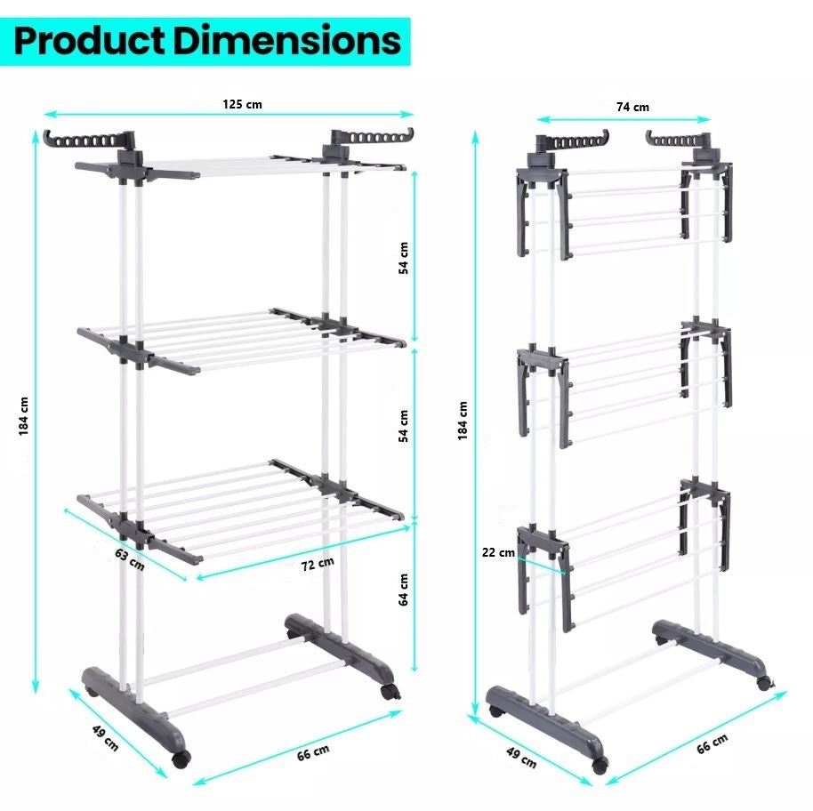 Size: The clothes dryer has dimensions of 66cm (L) and 125cm (with wings hooks open) x 49cm (W) and 63cm (with racks open) x 184cm (H).