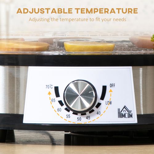 Dry fruit, vegetables and other foods in an easy and hygienic way: do it with this HOMCOM dehydrator. Easily adjust the temperature between 35? and 70? to wither fruits, vegetables and other ingredients in an effective way, The machine comes with five trays to separate and organise ingredients hygienically, with the 360 degree air circulation ensuring everything is even. Suitable for: fruits and vegetables, as well as making beef jerky, dried bread, crackers and so much more.