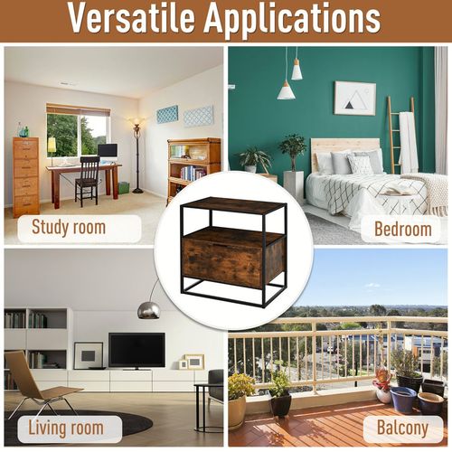 Industrial Style Side Table with Drawer Open Shelf Steel Frame