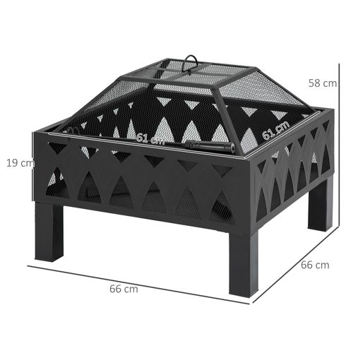 Mesh lid to protect sparks embers and debris flying out; - Comes with a poker, safe to move the wood logs; - Powder coated metal withstands high temperatures; - Four support feet for keeping balance