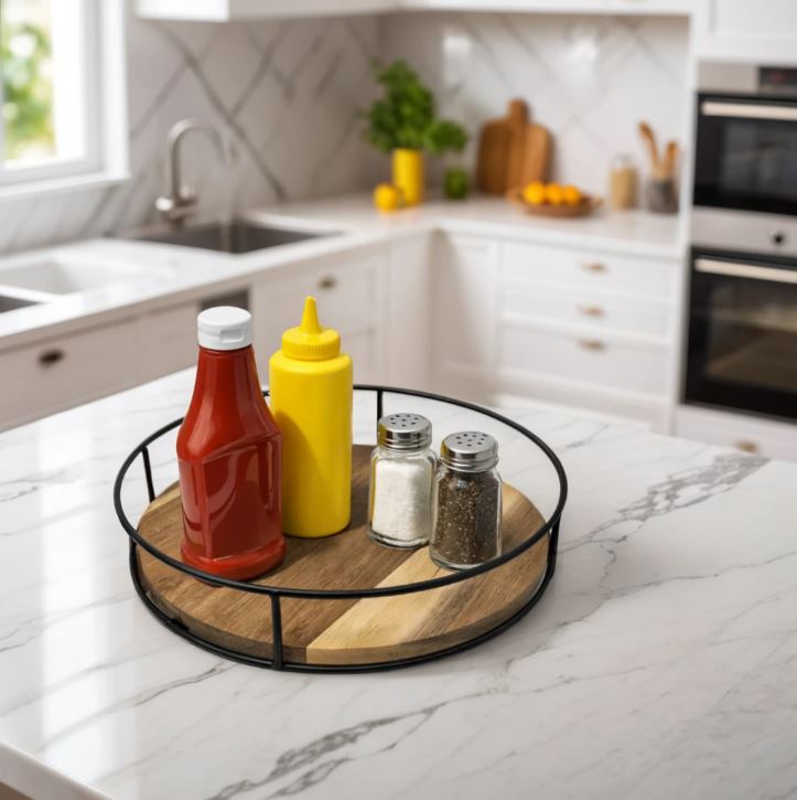 It also works brilliantly as a kitchen countertop organizer, keeping olive oil, condiments, salt and pepper shakers and everyday essentials organised without crowding your worktop. The raised edges help keep items secure while rotating, making it ideal for busy kitchens where convenience matters.