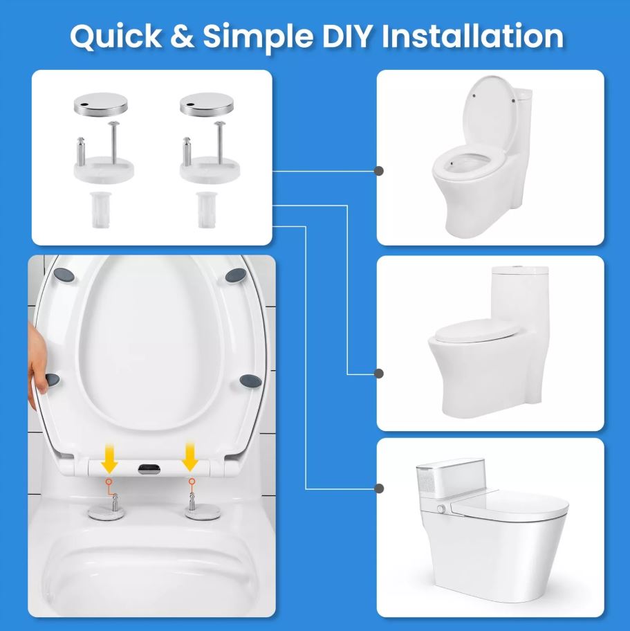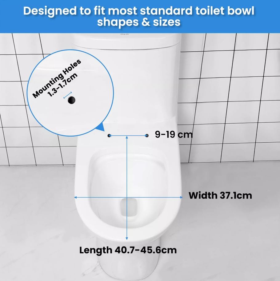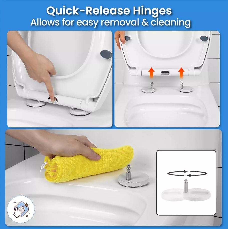 Easy to Clean: The loo seat has quick-release hinges for effortless cleaning. Simply press a button to detach the seat, making it easy to wipe down with a damp cloth.