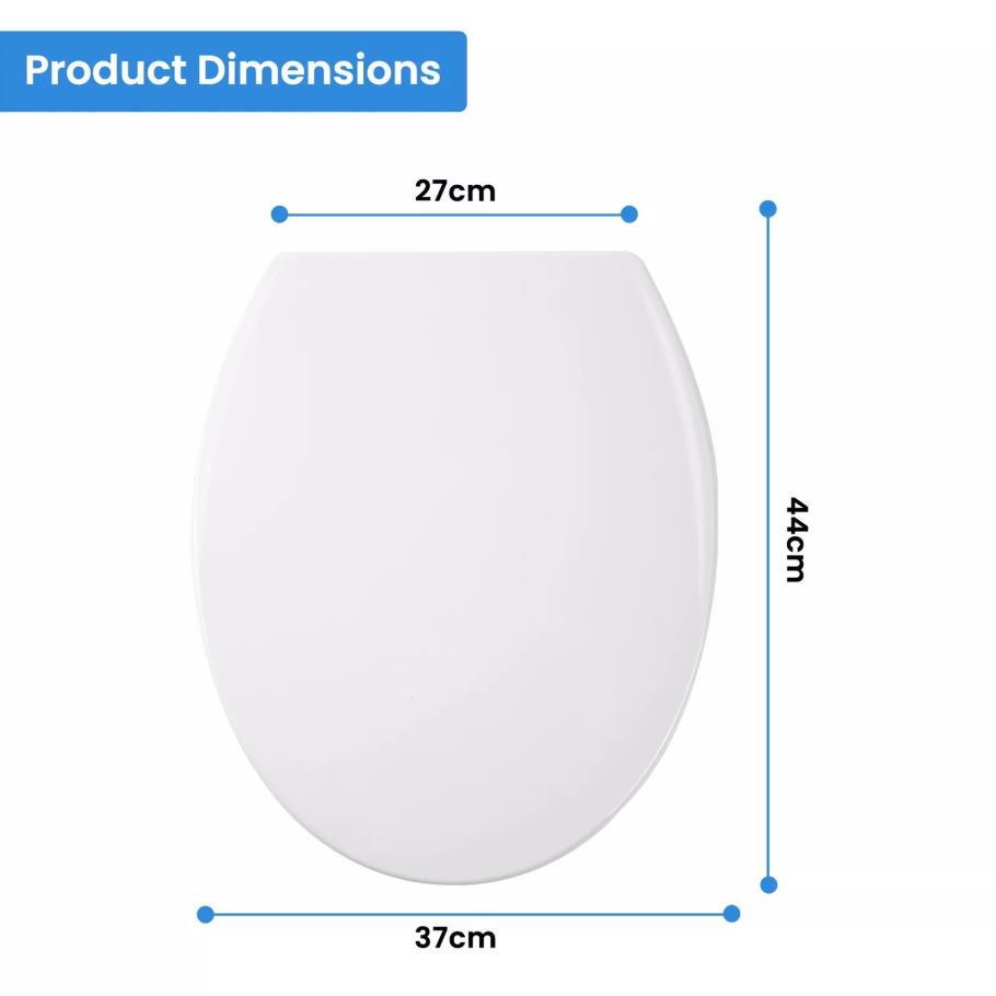 Size: Measures 44cm (L) x 37cm (W) in size. Its 360° adjustable hinges provide easy assembly, allowing it to fit on standard toilet bowls. This oval toilet seat is versatile enough for bathrooms.