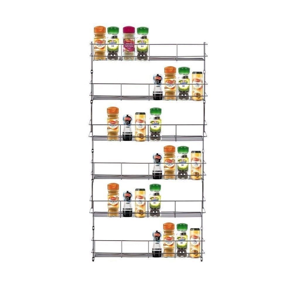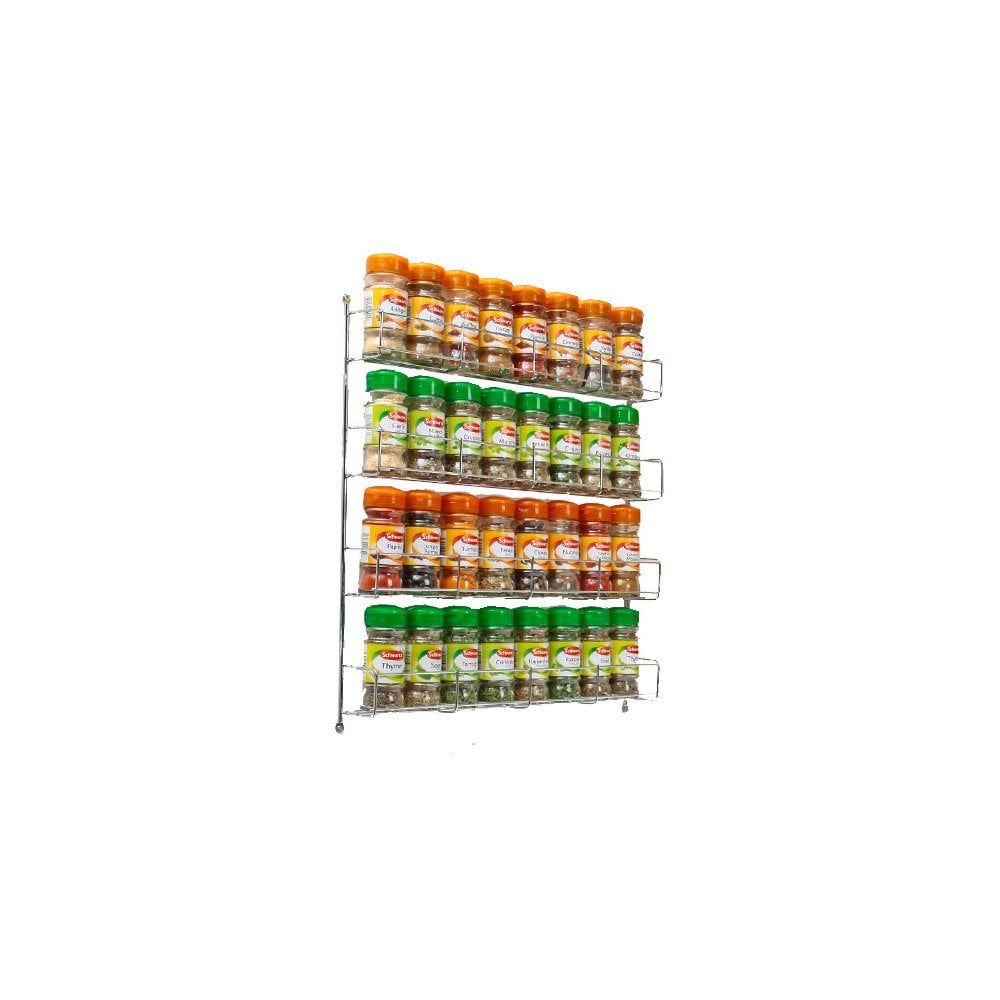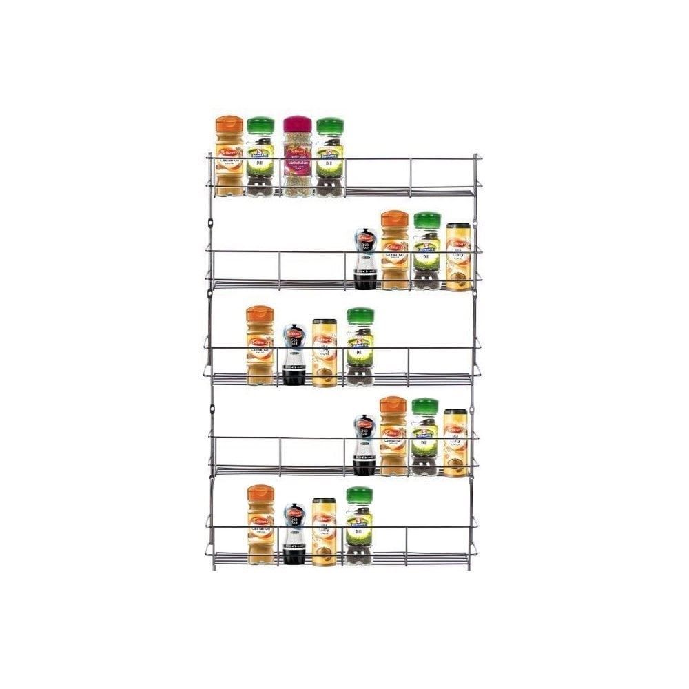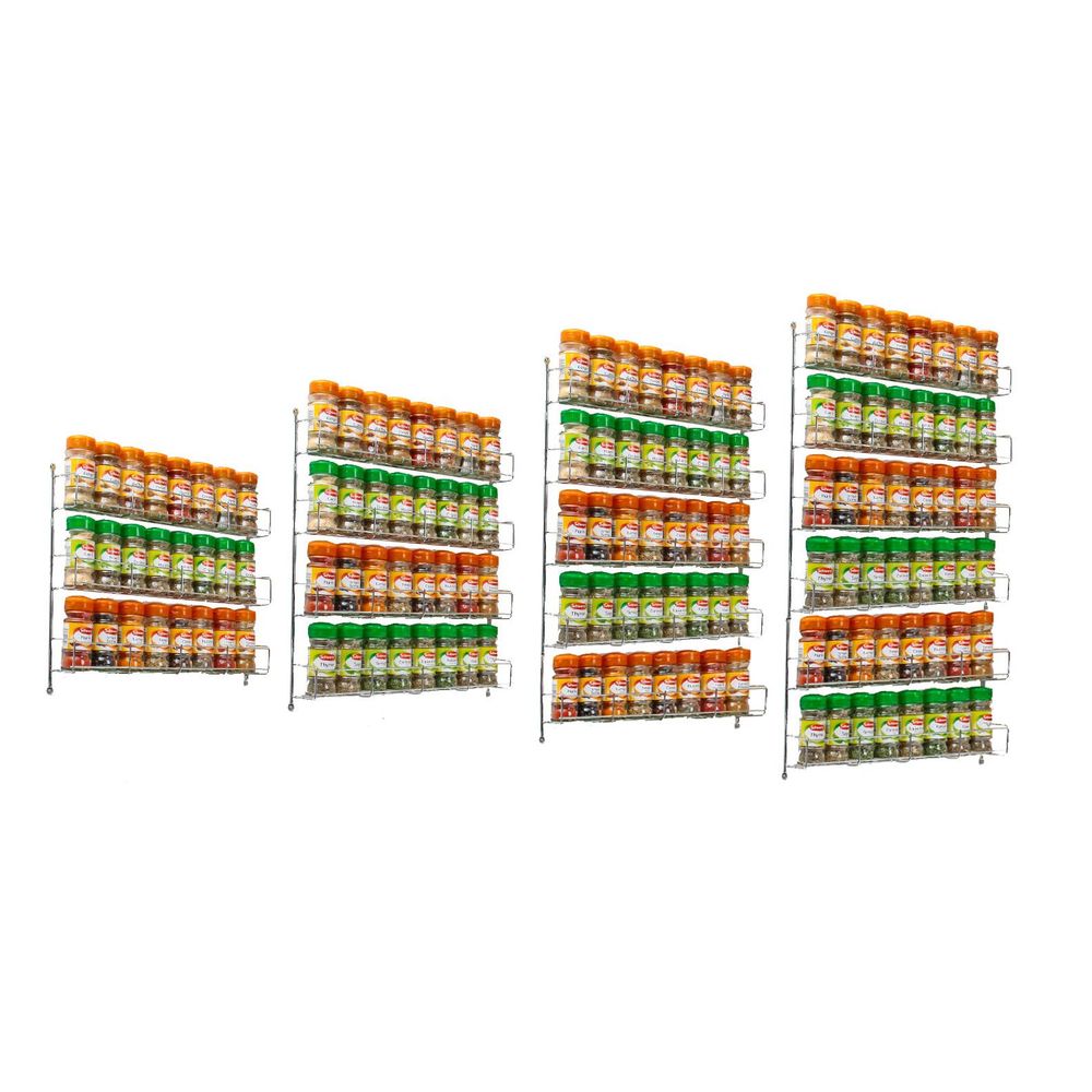 Holds approximately eight jars per tier. Includes a screw and plug fixing kit. Chrome stainless steel anti-scratch finish. Can be mounted on a wall or a cupboard. Spices not included.